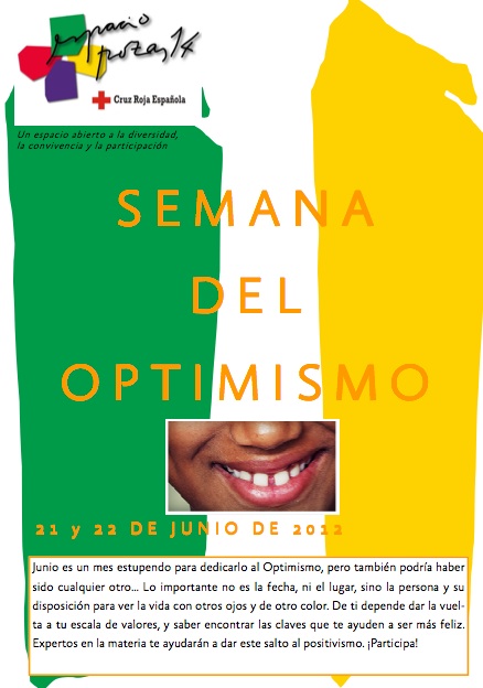 Encuentro ciudadano participativo (Jornada);Abre las Puertas al Optimismo en tu Barrio". Semana del optimismo… ¡Sonríe. Espacio Pozas 14 de Cruz Roja jueves 21 de junio 2012.